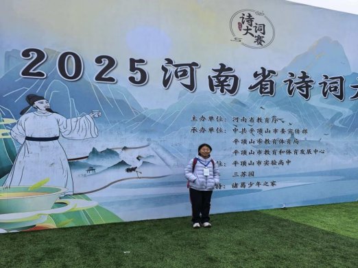 本次大赛由河南省教育厅办公室主办,旨在传承中华优秀传统文化,激发青少年对古典诗词的热爱。赛事覆盖全省各地,个人赛与团体赛均吸引了众多诗词爱好者参与,历经多轮筛选,竞争尤为激烈。朱晓彤同学自参赛以来,始终保持着对诗词的热忱与专注:在贾晓华老师的帮助下,她利用课余时间广泛诵读经典、深耕细研,从先秦诸子的哲思佳句到唐宋名家的千古绝唱,贾老师不仅帮她梳理诗词脉络、解析深层意境,更在备赛压力较大时及时疏导情绪、给予信心鼓励。