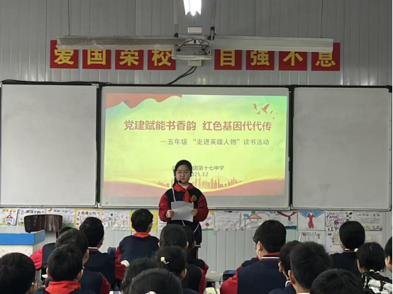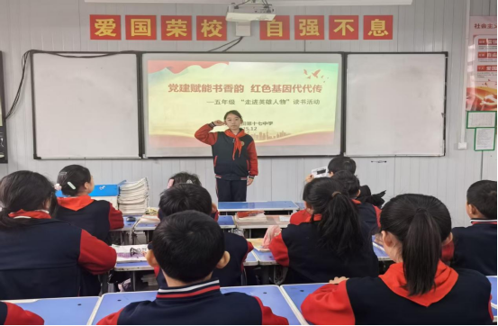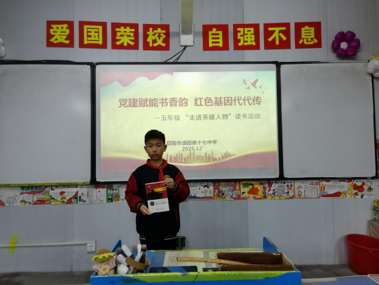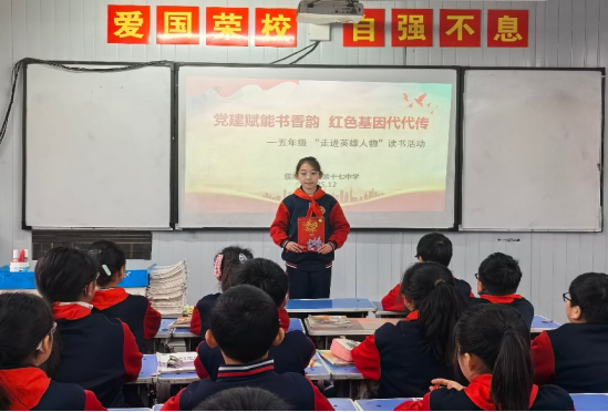 英雄,是历史长河中不灭的灯塔,是民族精神里永恒的丰碑。为引导学生铭记红色历史、致敬革命先辈,传承和弘扬英雄精神,近日,濮阳市油田第十七中学五年级组开展了“红色经典 走进英雄人物”主题读书分享活动,让红色故事在校园里落地生根。