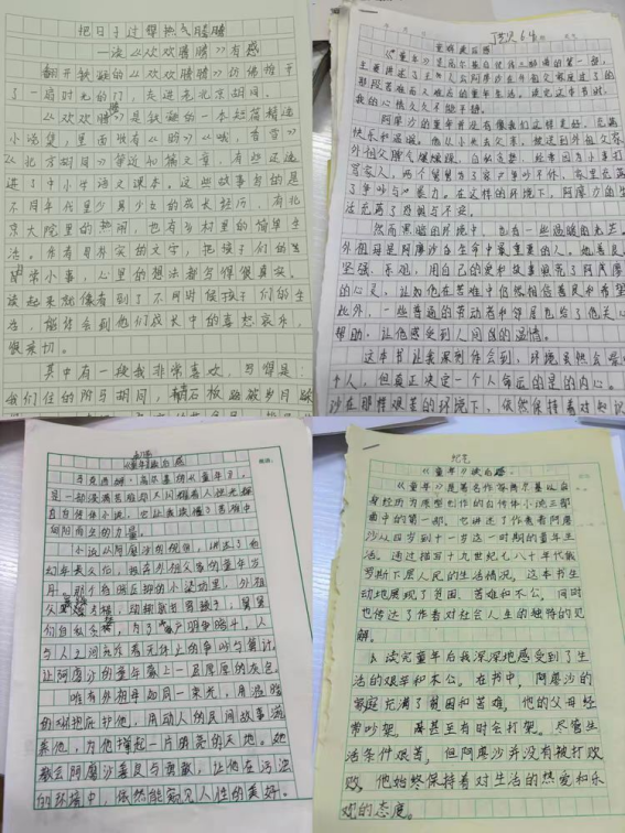 有的学生在手册里写下:“鲁滨逊的荒岛求生,让我明白坚持和智慧能战胜一切困难”;有的则感慨:“《童年》里的阿廖沙教会我,即便身处黑暗,也要心向光明”。文字的力量,在沉浸式的阅读中悄然浸润心灵。阅读不仅改变了孩子们的思维方式,也悄然改变了他们的语言与情感表达。在“读后感”专题写作中,六年级学子用真挚的文字记录下阅读带来的心灵触动。