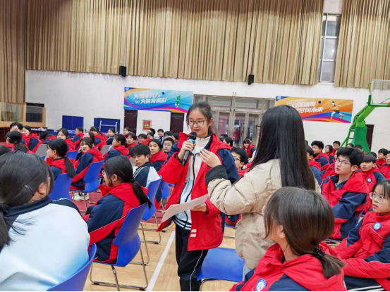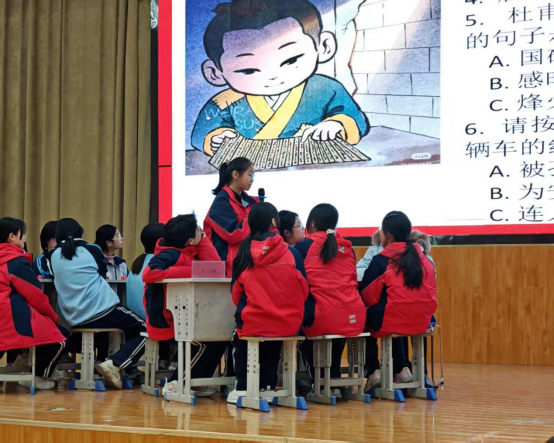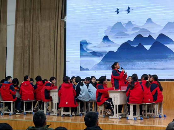 整场活动的高潮当属“巅峰对决”,选手们围绕“风、花、山、水”四字展开飞花令比拼。“春风又绿江南岸”“霜叶红于二月花”“远上寒山石径斜”“水光潋滟晴方好”……选手们才思敏捷、妙语连珠,一句句经典诗词脱口而出,时而引经据典,时而即兴应答,精彩表现赢得台下掌声阵阵、喝彩连连。当然在场的七八年级的观众同学们也参与其中,镜头时不时转向观众席,由观众席同学补充台上同学回答错误的问题并获取奖励。