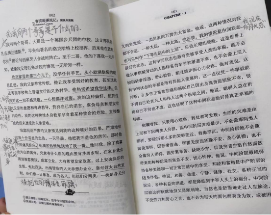 阅读过程中,鲁滨逊面对困境时的冷静、乐观与坚持不懈,深深打动了每一位学生。在分享会上,有同学说:“鲁滨逊独自在岛上生活了二十八年,没有放弃希望,这种精神让我明白,学习中遇到的困难根本不算什么。”还有同学谈到,从鲁滨逊搭建房屋、种植庄稼、驯养牲畜的过程中,学会了“遇到问题想办法”的处事态度。大家各抒己见,在思想的碰撞中深化了对作品的理解。