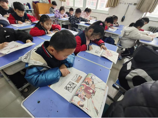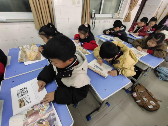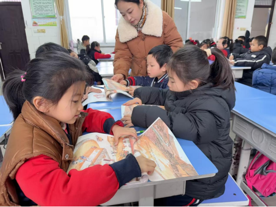 孩子们用手指一个字一个字地读着;同桌一起讨论插图中的年夜饭菜肴;靠窗的位置,几个孩子被“放鞭炮”的页面吸引,兴奋地小声交流着自己家放鞭炮的经历。