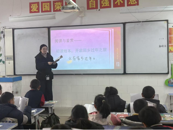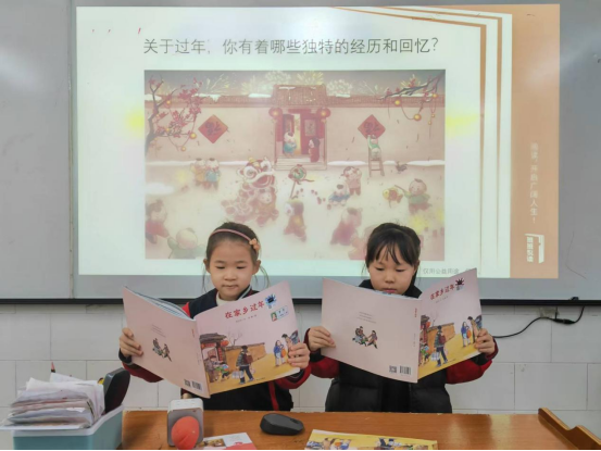 读到贴福字、吃年夜饭、放烟花的片段时,老师还结合课件里的图片,和孩子们聊自家的过年习俗。有的孩子说“我家过年会包饺子”,有的说“我和爷爷一起贴春联”,课堂上没有枯燥的讲解,只有跟着故事的沉浸式阅读和叽叽喳喳的讨论,绘本里的文字和插画仿佛活了过来,孩子们跟着主人公一起体验了返乡过年的快乐。