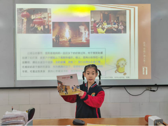 最精彩的当属上台分享环节!孩子们鼓足勇气走上讲台,拿着绘本分享自己的阅读收获。“我喜欢书中贴春联的部分,去年爸爸教我写福字,还贴在了大门上!”“我的家乡过年会包汤圆,甜甜的超好吃!”稚嫩的声音里满是自信,台下同学听得津津有味,时不时报以热烈掌声。