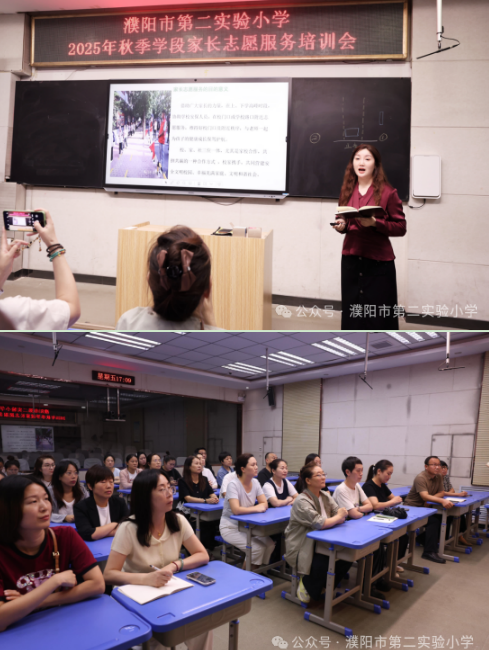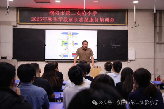 为进一步提升家校共育志愿服务工作质量、切实保证广大学生安全,9月5日,濮阳市第二实验小学(以下简称“市二实小”)在录播室举行家长志愿服务专题培训会。市二实小家教中心主任杨亚娟老师进行专题培训。该校副校长李建方,校长助理李秋杰、安全办主任赵肖龙、各年级德育负责人以及家长志愿者代表共40余人参加。