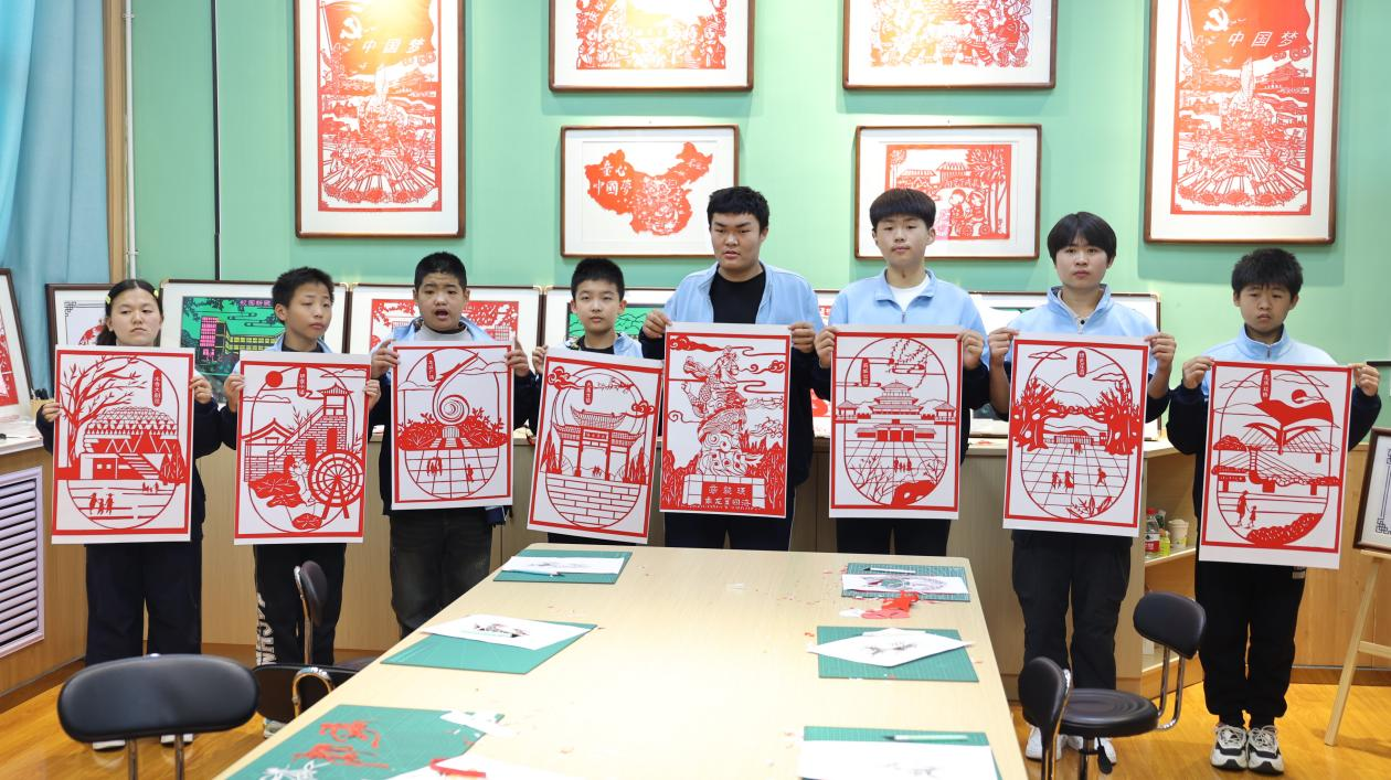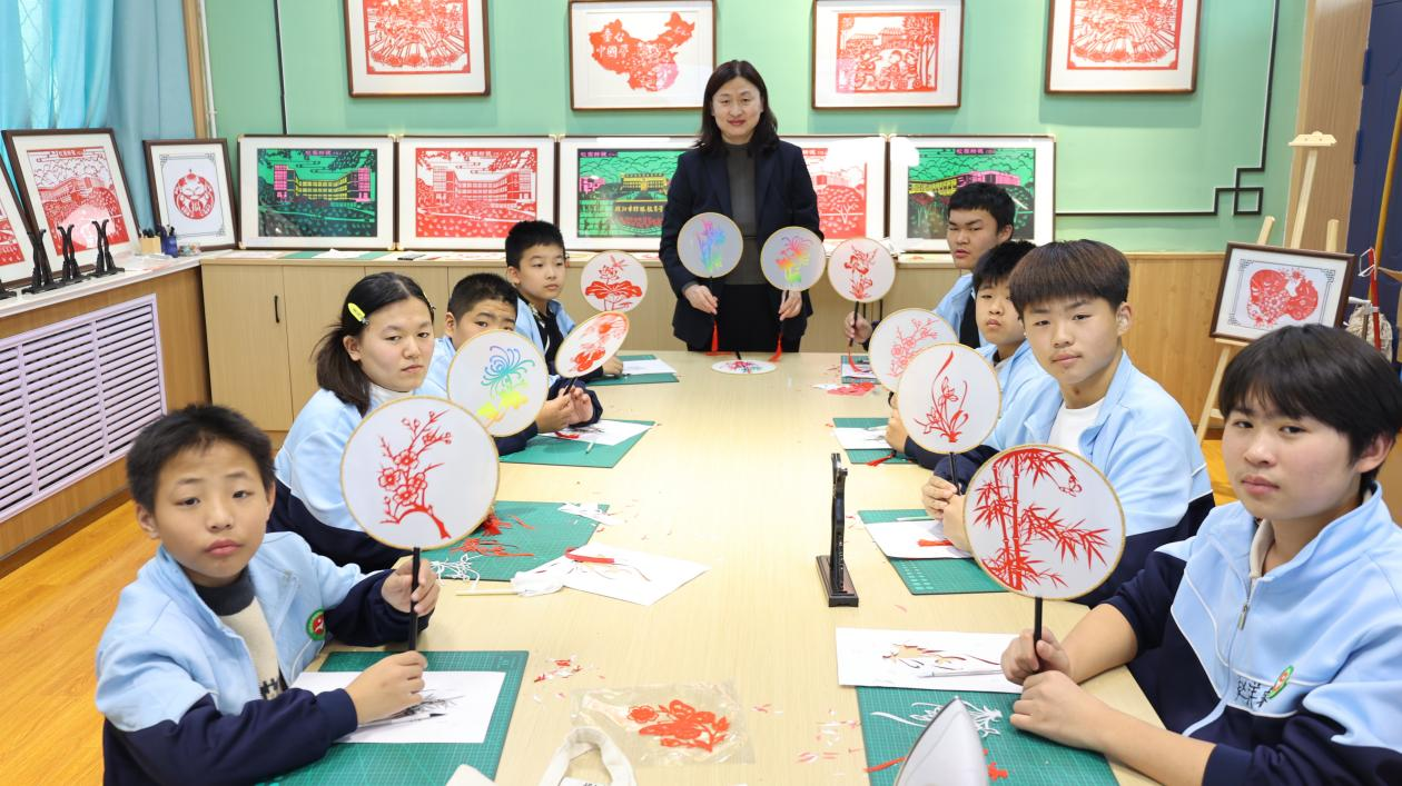 剪纸社团的学生正在进行一场团扇剪纸技能大赛,他们手持剪刀,灵活裁剪,纸屑纷飞间,一幅幅栩栩如生的作品跃然纸上,梅兰竹菊、花鸟鱼虫,无不展现出独特的艺术创意。