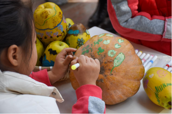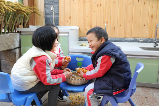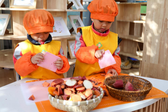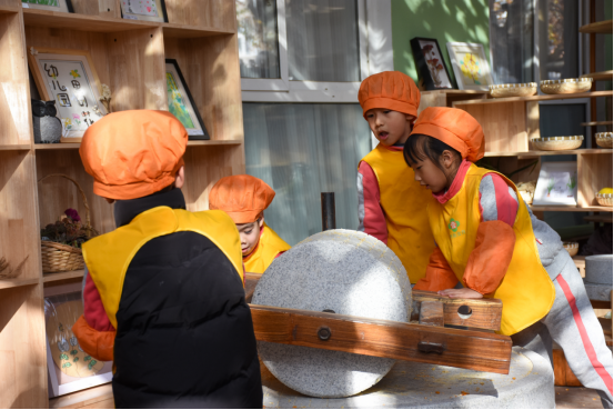 四时咕噜栈内,推磨声、欢笑声与南瓜、芋头的香气相融,幼儿在真实劳动场景中体会食物来之不易,传承勤俭节约的生活美德。