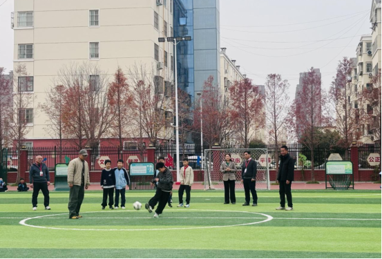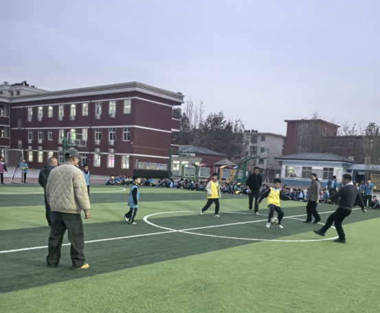 活动开场,学校体育组教师以活力满满的团体操表演拉开序幕,整齐的动作、昂扬的姿态,既彰显了体育教师的专业素养,也为赛事营造了热烈氛围。随后,校领导与学生代表组成的足球队同场竞技:传球、跑位、射门间,校领导们以平等参与的姿态融入队伍,与孩子们并肩协作,赛场上传递的不仅是足球,更是师生间的情感联结与榜样力量。同期,五年级全体学生作为观赛代表,全程观摩冠亚军决赛,在为选手呐喊助威的过程中,感受竞技体育的拼搏精神与团队凝聚力。