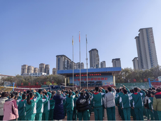主持人清亮而有力地宣布升旗仪式正式开始。国旗护卫队迈着铿锵步伐入场,《义勇军进行曲》奏响,五星红旗在全体师生庄严注视下冉冉升起。大家齐声高唱国歌,心中凝聚起“升华校园精神文明建设内涵”的共同目标,定格成冬日龙城最昂扬的画面。