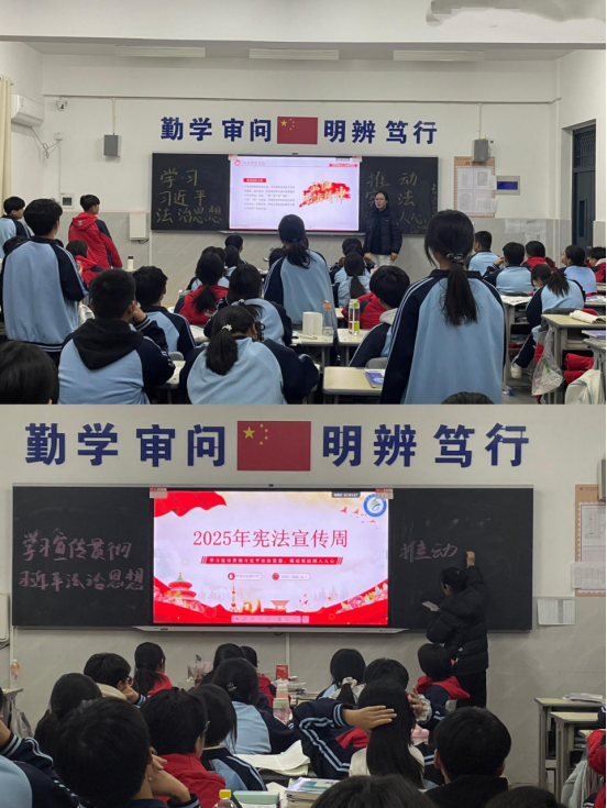 各班于12月1日召开宪法主题班会,各班班会内容丰富、形式多样。班主任们结合学生成长实际,通过案例分析、知识问答、小组讨论等形式,深入浅出地解读宪法条文。从“中华人民共和国的一切权力属于人民”的核心原则,到与学生息息相关的受教育权、劳动权等权利义务,再到维护国家统一、遵守公共秩序等公民责任,老师们用贴近生活的语言让抽象的法律条文变得具体可感。在互动环节,同学们积极发言,分享自己对宪法的认知,围绕“如何在校园生活中践行宪法精神”展开热烈讨论,进一步强化了法治观念,将宪法意识内化于心、外化于行。