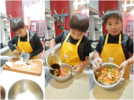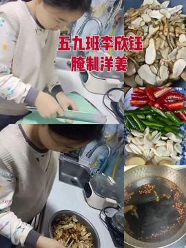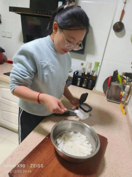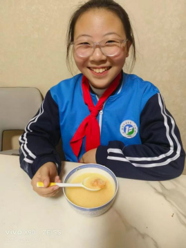 大雪节气,冬藏进补。晚上回到家中,同学们在家长的帮助下,亲手烹制大雪节气传统食物:熬红薯粥、腌咸菜、腌腊肉等。同学们不禁感慨:“自己煮的粥,特别甜;自己腌的菜,特别香。”