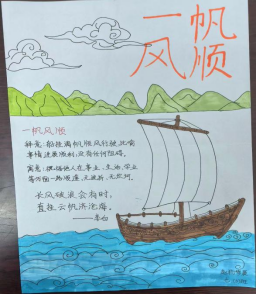 有同学描绘“一帆风顺”:海水中一艘木船,船帆张满,顺风行驶,近处的帆船与远处的青山、白云交相呼应,辅以李白“长风破浪会有时,直挂云帆济沧海”的名句,生动诠释了一路顺遂的道理。