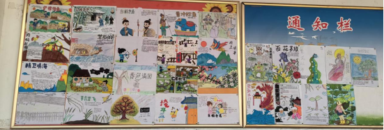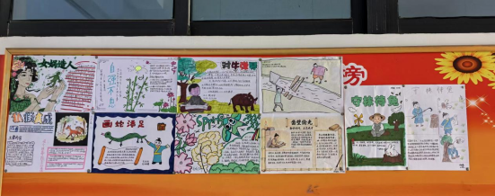 获奖作品正在初中部教学楼一楼和二楼表彰栏处展出,吸引了众多师生驻足欣赏。一幅幅充满创意的成语画作,像一扇扇窗户,透过它们,我们看到了成语的鲜活面貌,更看到了七年级同学们的无限创意。