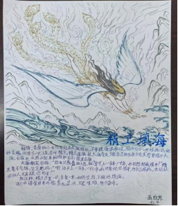 有同学为“精卫填海”配图:精卫渺小的身影与浩瀚的大海形成强烈对比,凸显其“意志坚决,不畏艰难”的精神。整体画面充满动感与张力。精卫飞翔的姿态充满力量感,象征着不屈不挠的奋斗精神。