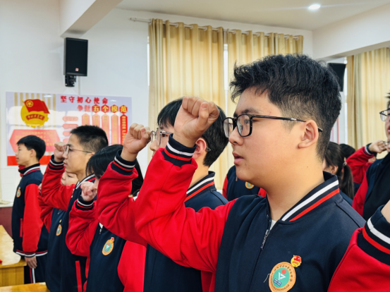 入团仪式中,学校团委书记孙玉明宣读新团员名单,老团员为新团员郑重佩戴团徽、颁发团员证。当熠熠生辉的团徽佩戴在胸前,新团员们的脸上洋溢着自豪与坚定。在鲜艳的团旗映衬下,新团员高举右拳,面向团旗庄严宣誓,铿锵有力的誓言既是对共青团组织的郑重承诺,也是对传承“一二・九”爱国精神的坚定表态。
