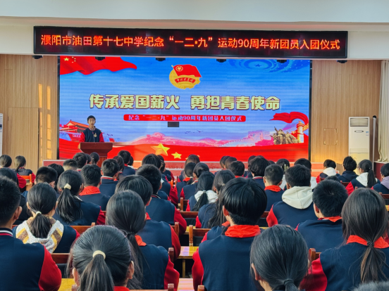 为铭记“一二・九”运动峥嵘历史,传承爱国精神,强化青年理想信念教育,近日,濮阳市油田第十七中学隆重举行纪念“一二・九”运动90周年新团员入团仪式。学校领导、校团委成员及全体新老团员参加仪式,共同见证新团员的青春誓言与责任担当。