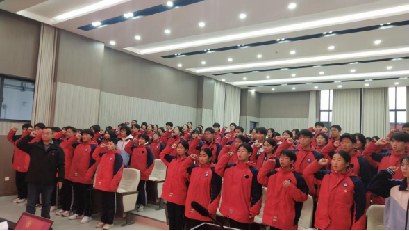 紧接着,仪式进入最神圣的宣誓阶段。在校团工委书记朱庆涛的带领下,全体新团员面向鲜艳的团旗,高举右拳,以饱满的热情和坚定的声音庄严宣誓:“我志愿加入中国共产主义青年团,坚决拥护中国共产党的领导,遵守团的章程,执行团的决议,履行团员义务,严守团的纪律……”铿锵有力的誓言在会场回荡,表达了新团员们坚定不移跟党走、为共产主义事业奋斗终身的初心与决心。宣誓完毕,新老团员一同报出姓名,这一刻,个人的成长与组织的使命紧密相连。