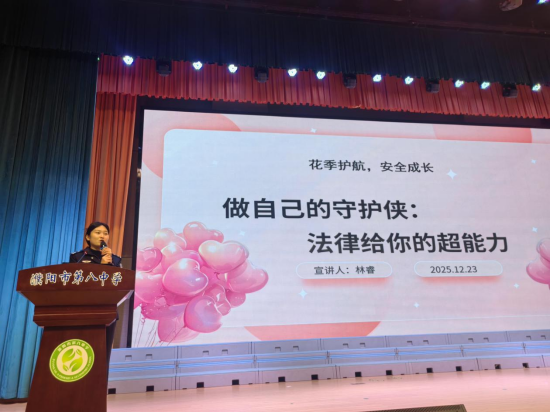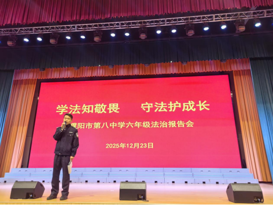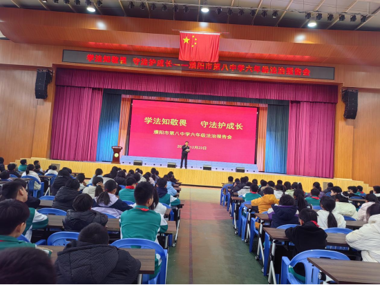 为扎实推进未成年人法治教育工作,将法治种子播撒在青少年心中,12月23日,濮阳市第八中学以“学法知敬畏 守法护成长”为主题,邀请学校法制副校长、濮上派出所副所长马雪磊与濮上派出所民警林睿从不同角度展开法治宣讲,为六年级全体学生送上了一堂兼具专业性与趣味性的法治教育课。