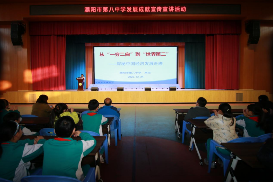 为深入学习贯彻习近平新时代中国特色社会主义思想和党的二十届三中全会精神,讲足新时代伟大成就,讲好中国经济故事和濮阳发展故事,引导青少年感悟时代变迁、坚定理想信念,濮阳市第八中学于12月24日开展发展成就主题宣讲活动。学校政治教师高运以《从“一穷二白”到“世界第二”——探秘中国经济发展奇迹》为主题,面向六年级全体师生讲授大思政课,以生动鲜活的形式宣讲中国经济发展成就,推动思政教育入脑入心,激励青少年以拼搏之姿奋进新征程。