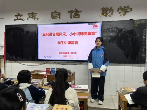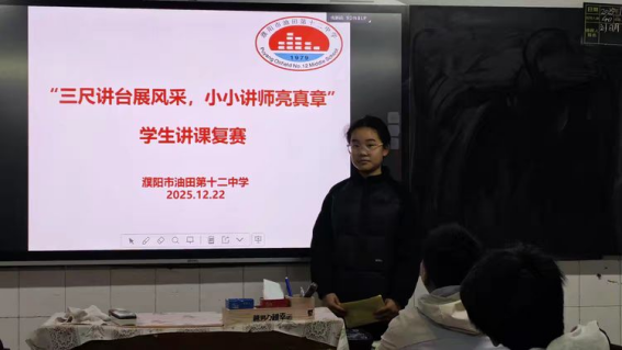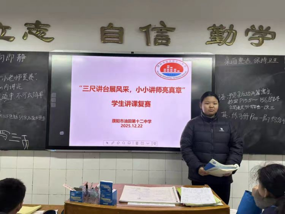 以党建为引领,筑牢育人根基,深入贯彻素养教育理念,激发学生自主学习与语言表达潜能,营造“以讲促学、以赛促优”的优良育人氛围,濮阳市油田第十二中学于2025年12月8日至23日成功举办“三尺讲台展风采,小小讲师亮真章”学生讲课比赛。本次赛事覆盖七、八、九年级全体学生,涵盖全学科领域,历经班级初赛、复赛及年级决赛三个阶段的层层遴选,最终涌现出一批综合素质过硬、教学潜质突出的“小讲师”,为校园文化建设注入新的活力。