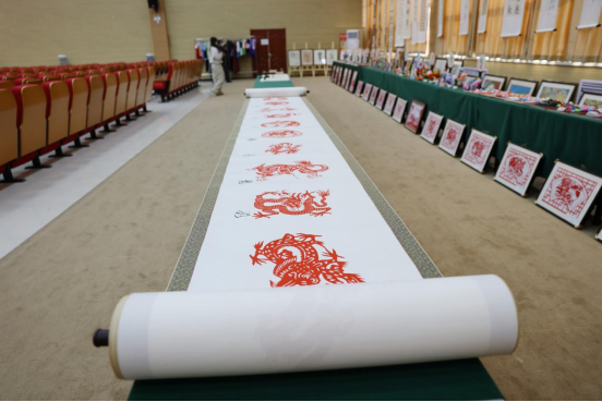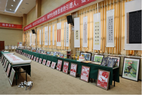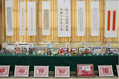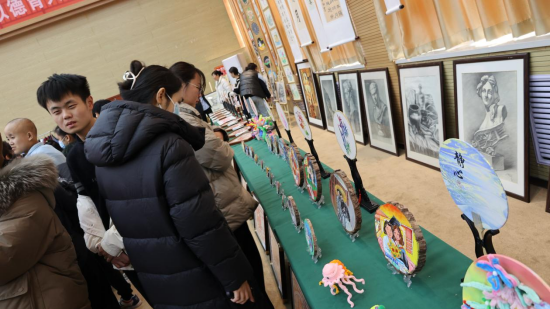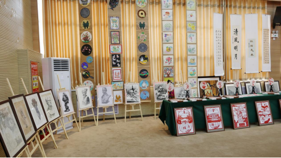 展厅里,一幅幅、一件件饱含新意的作品,是学校艺术教育成果的真切见证。美工区的手工作品精巧别致,折纸、黏土造型栩栩如生,每一个细节都藏着孩子们的奇思妙想;素描作品线条细腻,静物、人物刻画精准,透过铅笔的深浅交错,能看到学生对世界的细致观察;色彩作品绚烂夺目,水彩的清新、油画的厚重,斑斓的颜料描绘出心中的美好天地;书法作品或工整端庄,或洒脱飘逸,笔墨间尽显持之以恒的练习与沉淀;剪纸作品线条细腻、镂空精巧,有的勾勒建筑风貌,有的裁剪装饰纹样,形态各异的百龙图更是惊艳全场。这些作品不仅是艺术的呈现,更是学校“以美育人”教学理念的生动实践,彰显了特殊学生超越障碍的创造力与生命力。