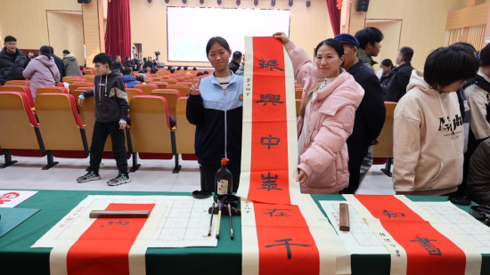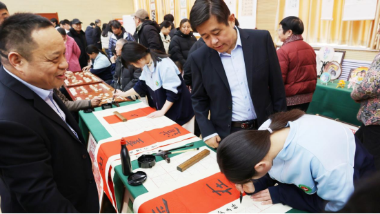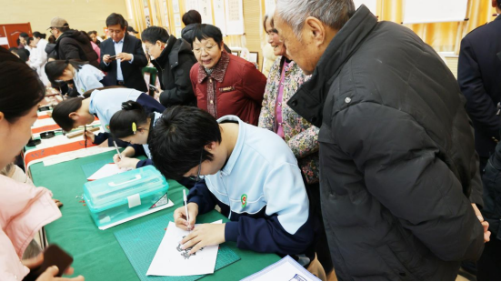 剪纸与书法动态体验区前人头攒动,灵巧的指尖翻飞间,一张张精美的剪纸、一幅幅工整的书法作品应运而生,他们还热情地将作品赠予观众,在互动中传递传统文化的魅力。