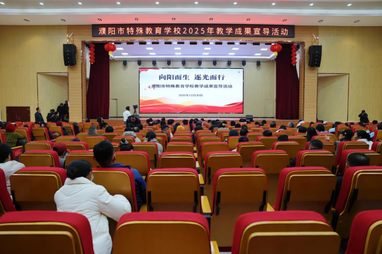 为集中展示“十四五”特殊教育发展成果,搭建交流互鉴平台,12月30日下午,濮阳市特殊教育学校成功举办“向阳而生 逐光而行”教学成果宣导活动。本次活动集节目演出、励志演讲、艺术展示、元旦联欢为一体,既是学校特殊教育教学成果的集中检阅,更是特殊孩子用自信与才华书写的“成长答卷”。市委组织部、市委宣传部、市教育局、市残联、市财政局、市广播电视台等单位相关领导及市特校教职工、学生和家长代表共400余人参加了本次活动。