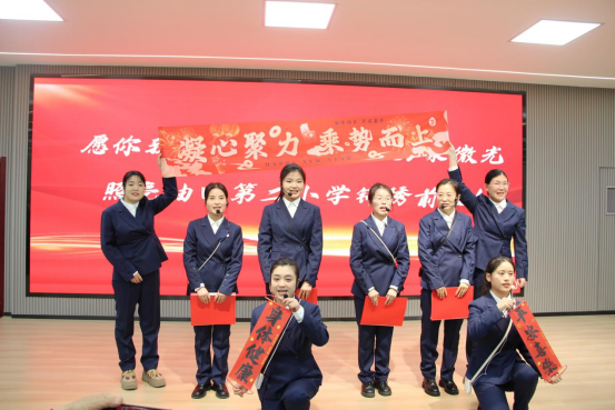 伴随着轻柔舒缓的背景音乐,主持人的一句“以爱为犁耕耘不辍,以梦为马步履铿锵”,精准勾勒出全体教职工一年来的坚守与担当,瞬间点燃了现场的温馨氛围。随后,各年级组、学科组及行政教辅组的老师们依次登台,用真挚的情感、饱满的热情,为现场观众呈现了一场精彩纷呈的诗意展演。