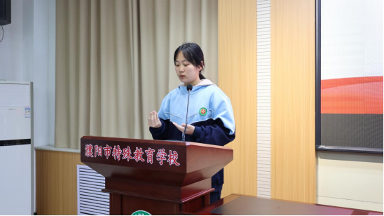 在团员代表发言环节,张彤、郭子冰两名同学结合自身学习与成长经历,分享了在特殊教育校园里的奋斗感悟与青春思考。他们用真挚的语言讲述了克服困难、追逐梦想的历程,展现出我校团员青年残而有为、残而有志的精神风貌,引发了在场师生的强烈共鸣。
