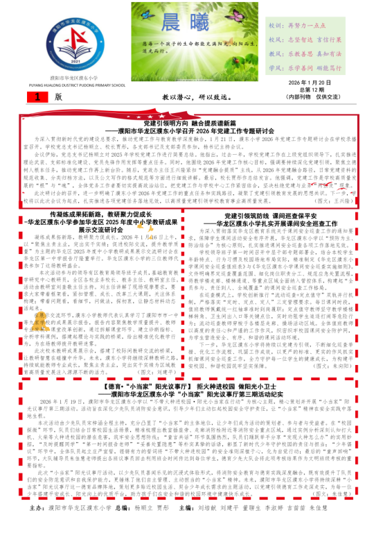 第一版聚焦学校发展,党建工作专题研讨会明确了新一年的方向,教研成果展示让老师们的智慧碰撞出火花,课间安全巡查则织起一张守护孩子的安全网,为校园稳稳筑牢了安全防线。