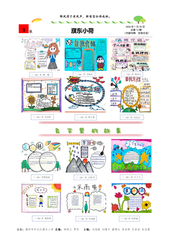 第三版是孩子们的创意天地,“濮东小荷”里的自我介绍手抄报色彩斑斓,“名字里的故事”画作充满奇思妙想,一笔一画都是他们对名字世界的独特表达。
