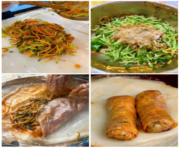 透亮的凉皮摊开,铺上黄瓜丝、豆芽、面筋、花生碎,淋一勺芝麻酱,点几滴辣椒油,三下两下卷成圆筒状。