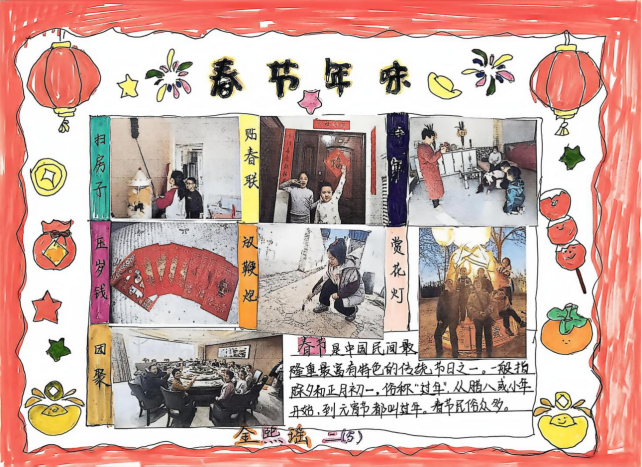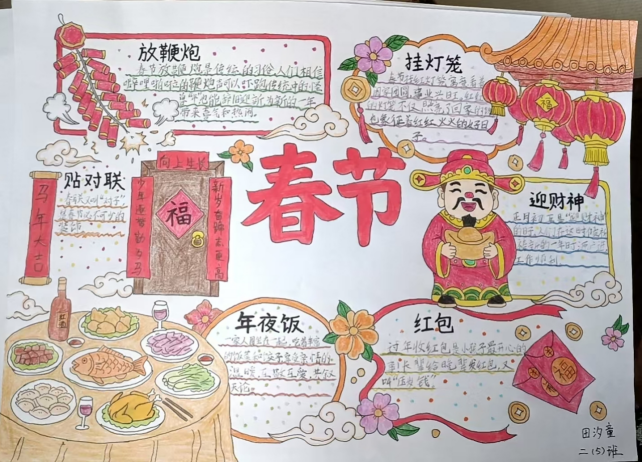 除了探寻年俗,孩子们还在实践中践行文化传承,用笔墨书香浸润假期。结合语文学习,年级组发起“新春书法展”活动,同学们以笔为媒,将《元日》《江南》等经典诗词与新年祝福融入方格之间,一笔一划尽显认真,一撇一捺皆是诚意。同时,一张张图文并茂的寒假手抄报成为孩子们展示假期生活的舞台,“放鞭炮”“挂灯笼”“年夜饭”“迎财神”等板块色彩鲜艳,不仅记录了春节习俗,更展现了孩子们对传统文化的理解。