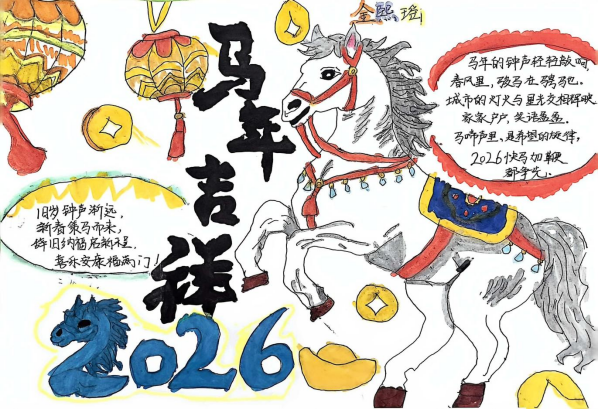 春节作为中华民族最隆重的传统节日,蕴含着深厚的文化底蕴。寒假期间,二年级的同学们化身“年俗小研究员”,在家人的陪伴下沉浸式体验传统民俗。洛邑古城的花灯下,有他们身着汉服、手持团扇的灵动身影;自家门前的台阶上,有他们踮脚贴福、挂春联的认真模样。包饺子、做花馍,孩子们揉、捏、折、按,将对新年的美好期盼融入指尖;剪窗花、做手工,彩纸、黏土在一双双小手中变幻出形态各异的“福马”,“一马当先”的黏土作品、红彤彤的纸艺鞭炮,每一件作品都充满童趣与创意。