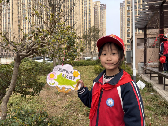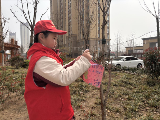 化身绿色小卫士,孩子们为小区里的小树挂上精心制作的植物介绍牌与护绿标语,用一笔一画写下对自然的爱护,用小小行动守护身边的一抹绿意,让环保意识在心中生根发芽。