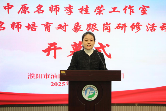 中原名师李桂荣工作室主持人、学校党支部书记、校长李桂荣在开幕式上致辞。首先对来自兄弟学校的校长、老师以及全体培育对象表示热烈欢迎,并深情回顾了工作室自成立以来,在探索教师专业成长路径、深化课堂教学改革方面所积累的实践经验和取得的初步成果。同时,李校长也详细介绍了油田第二小学的办学特色与发展成效。