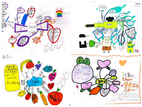 创作中,孩子们时而静心构思,时而低声讨论,在趣味满满的形式里感受数学的别样魅力。有的以“知识树”为框架,清晰标注“几个几相加”的本质含义、乘法口诀、乘加乘减变形,及乘数、积等概念;有的利用流程图呈现乘除互逆关系,将“21÷3=7”等逆运算与原算式巧妙的关联起来;还有的巧妙融入购物、分组等生活情境,让抽象的数学知识变得可感可触,数轴计数、实物示意等方法也成为他们表达理解的“小工具”,让抽象的思维看得见、摸得着。在“绘数学”的过程中,零散知识点被孩子们主动编织成有机的知识网络。