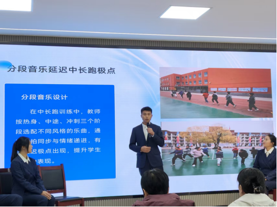音体相和,韵律赋能运动节奏。 多位老师不约而同地分享了音乐与体育融合的妙用。程亚楠老师在啦啦操教学中,为不同动作精准搭配相应风格的音乐,强化表现力;王成老师在中长跑练习中运用舒缓音乐,帮助学生调控呼吸与节奏;刘欣宇老师在篮球课上,通过变换音乐节奏来优化训练氛围与强度,实现了“1+1>2”的教学增效。