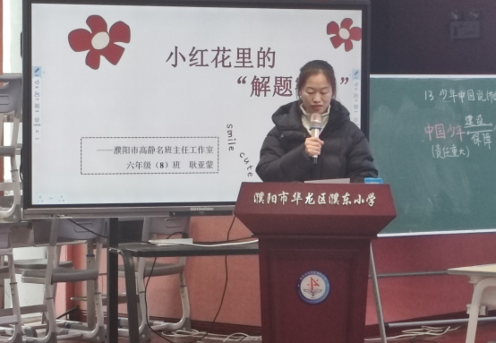 随后,六年级八班的耿亚蒙老师带来《小红花里的“解题密码”》,讲述了数学课堂上的转化故事。学生小哲曾用课本遮脸、作业空白,对学习毫无兴趣。为激发积极性,耿老师推出“数学小红花”活动,当小哲凭借生活经验准确解答应用题时,她及时送上小红花与肯定。这朵小小的红花成为转折点,小哲的作业变得工整规范,开始主动思考、请教问题,甚至帮助同学讲题,十朵小红花整齐贴在课本扉页,见证着他的成长与蜕变。