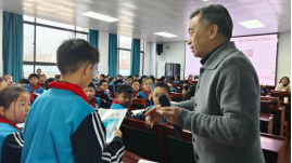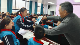 在互动环节,还设置了“背诵奖励书籍”环节。多名同学积极参与,现场气氛十分热烈。孩子们清晰、流畅地背诵,赢得了在场师生的阵阵掌声。魏胜先会长为参与背诵的同学赠送了书籍,以此鼓励大家继续保持阅读的热情。孩子们手捧新书,脸上洋溢着收获的喜悦,为本次活动增添了温暖。