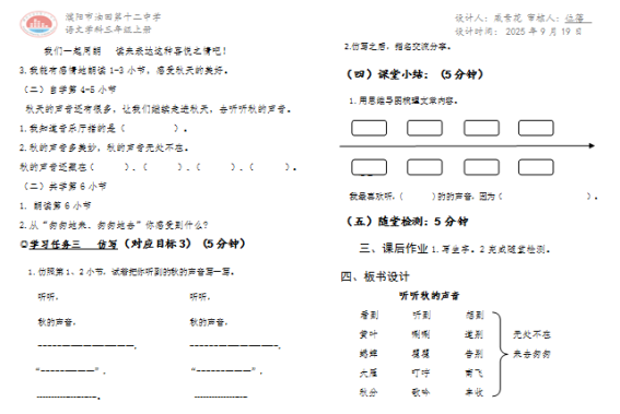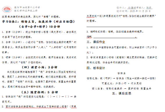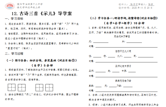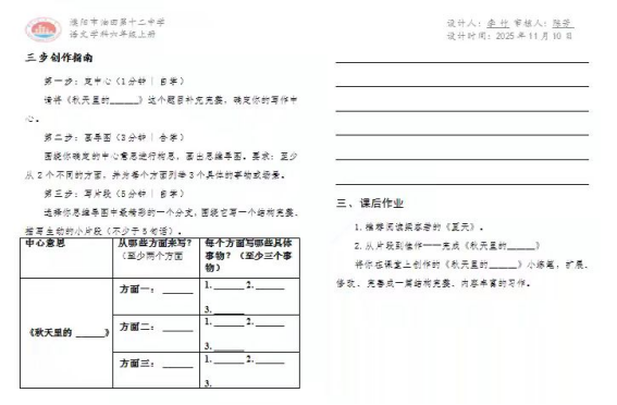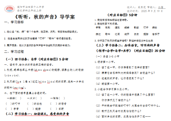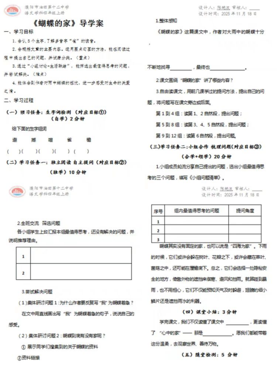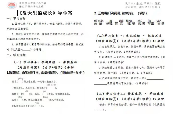 这些导学案是课堂转型的注脚:教师从“讲授者”变“策划者”,学生从“听众”成“发现者、合作者、表达者”。课堂上,秋声被创造、水果被赋予语言、文言焕发思辨光、蝴蝶的家显生命温度、现代诗飞向童心,《示儿》里的家国情怀在品读中传承、《珍珠鸟》中的信赖哲思在感悟中扎根——这正是课改的力量。