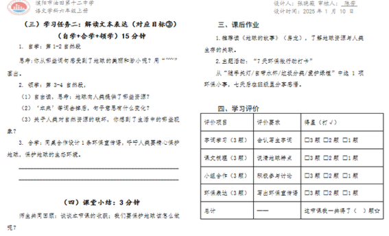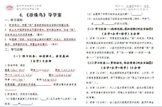 在2025-2026学年第一学期语文教研活动中,濮阳市油田第十二中学小学语文组以“改深化”为核心目标,将导学案化作前行帆,以“打造主动学习课堂”理念为领航舵,依托小组合作筑牢学习根基,凭借课评价管理激活内生动力,在3-6年级课堂中锁自主、合作、探究的学习新样态。通过学生独学自研、小组合学共探、同伴领学的阶梯式学习路径,让语文课堂真正成为学生核心素养拔节生长的沃土。