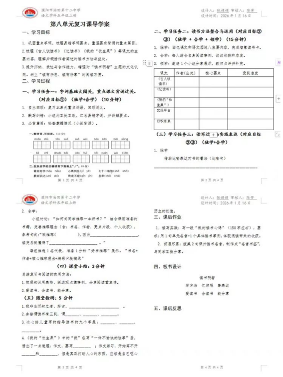 以“字词巩固—方法整合—读写实践”为路径,张娟娟老师带学生从复习单元重点字词、检查必背篇目,到梳理《古人谈读书》《忆读书》等课文的核心要点与读书方法,再通过写比喻句、推荐好书实现读写迁移。导学案以“学习任务+课堂小结+随堂检测”层层推进,搭配“智慧读书卡”“推荐句式”搭建学习支架;“独学+合学+领学”贯穿全程,小组互批纠错、分享阅读启发、展示好书推荐让学生主导学习,课后写读书心得与制作名言书签,则形成“课堂复习—课后拓展”的学习闭环,助力学生树立“读有所思、读有所享”的阅读习惯。