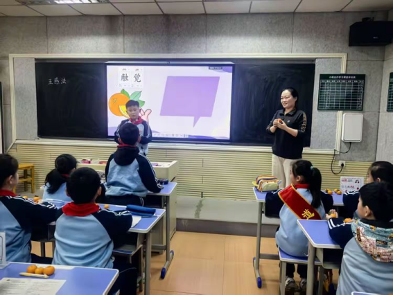 以砂糖橘为观察样本,王宁老师引导学生调动视觉、触觉、嗅觉、听觉、味觉,沉浸式感受水果特点。学生亲手捏、闻、尝、听,在“做中学”积累素材;小组内“小老师”带领观察记录,“兵教兵”让学习更高效;量化评价机制则推动学生主动反思,轻松掌握五感写作法。