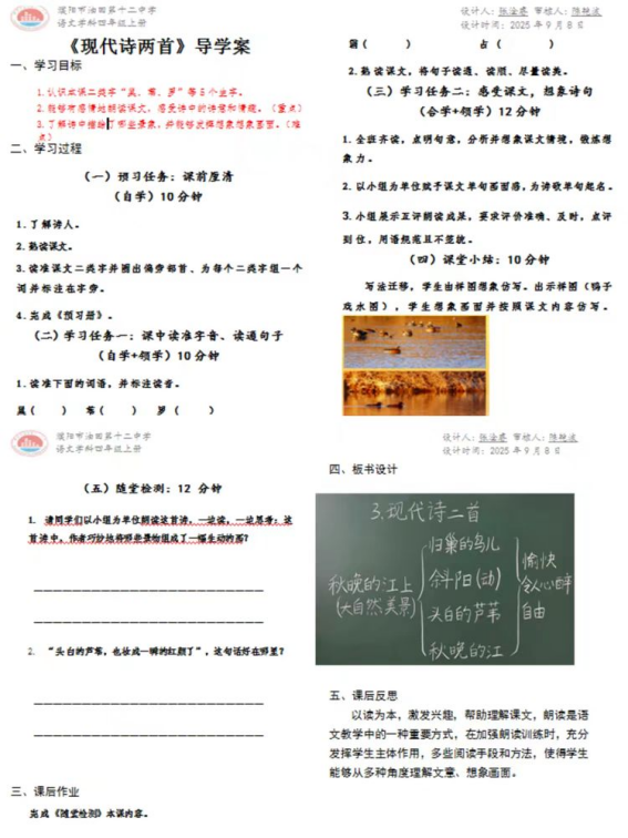 四大课改理念扎实推进,让“以生为本”深度融入教学细节。“先学后教”为深度学习奠基,每份导学案均设置明确预习任务,提前扫清基础障碍;“兵教兵”推动合作学习落地,“领学”成为课堂常态,小组合作贯穿问题梳理、写作实践、诗歌赏析等环节,且同步融入小组评价,通过量化反馈或互评交流,督促组员高效参与、互帮互学,让合作更具方向性与实效性;“当堂检测”强化学习闭环,每课均设计填空、仿写等随堂检测题,精准对应学习目标,搭配课后作业形成“学—练—拓”的完整链条;“支架设计”降低探究难度,导学案中的提问清单,为学生提供清晰学习路径,有效增强其探究信心。