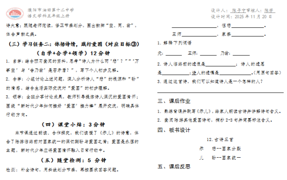 以“预习奠基—字词疏通—诗情体悟—行动延伸”为路径,陈子宁老师带学生从解读古诗文本走向传承爱国精神,构建从知识理解到精神践行的完整学习闭环。预习聚焦诗人陆游背景与字词基础,研读环节通过“自学、合学、领学”三重机制,层层剥开“悲”“盼”的情感内核与“爱国”的深层内涵;随堂检测与课后作业呼应,既巩固诗句、词义等知识,更引导学生从“读诗”迈向“践行爱国行动”。