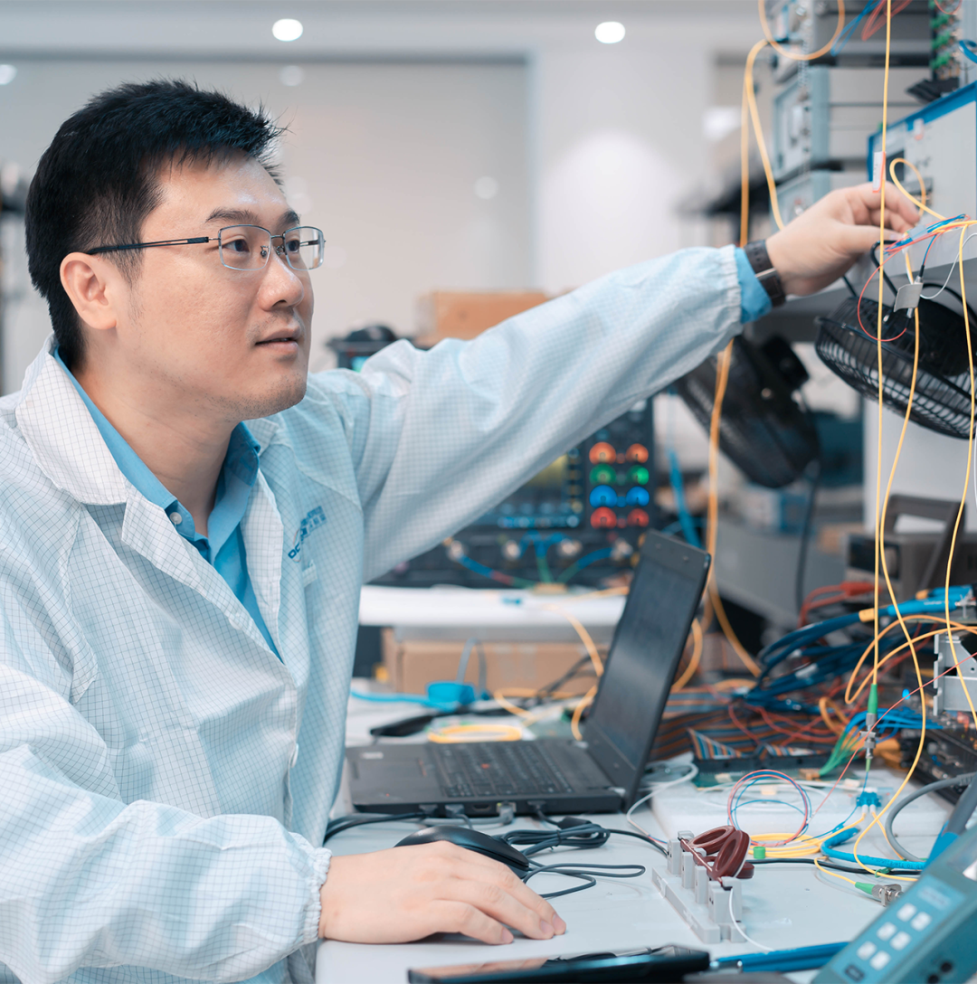肖希在调试超大容量单模多芯光纤传输实验系统。