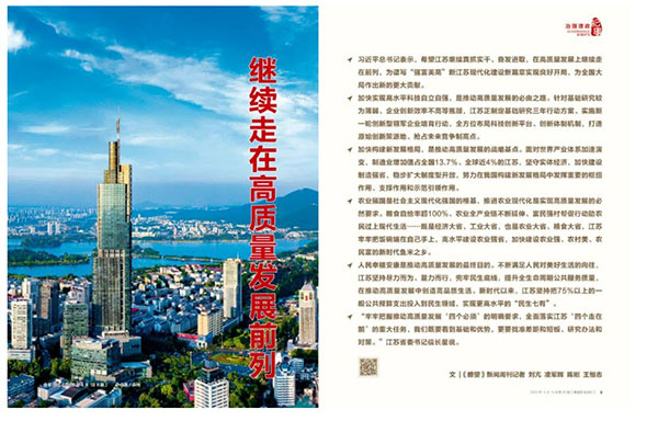 高质量发展是全面建设社会主义现代化国家的首要任务。江苏省委书记信长星表示,在科技自立自强上走在前、在构建新发展格局上走在前、在推进农业现代化上走在前、在强化基层治理和民生保障上走在前,涵盖了推动和实现高质量发展的必由之路、战略基点、必然要求、最终目的,是习近平总书记为我们推动高质量发展走在前列擘画的“路线图”。