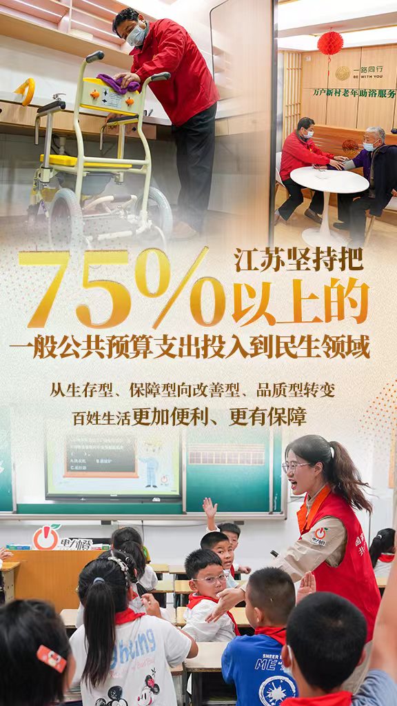 人民幸福安康是推动高质量发展的最终目的。不断满足人民对美好生活的向往,江苏坚持尽力而为、量力而行,兜牢民生底线,提升全生命周期公共服务质量,在推动高质量发展中创造高品质生活。新时代以来,江苏坚持把75%以上的一般公共预算支出投入到民生领域,实现更高水平的“民生七有”。
