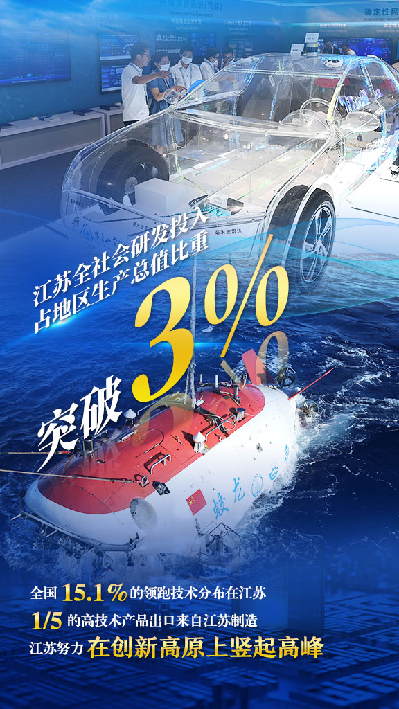 目前,江苏全社会研发投入占地区生产总值比重突破3%,达到创新型国家和地区中等水平;全国15.1%的领跑技术分布在江苏,五分之一的高技术产品出口来自江苏制造。